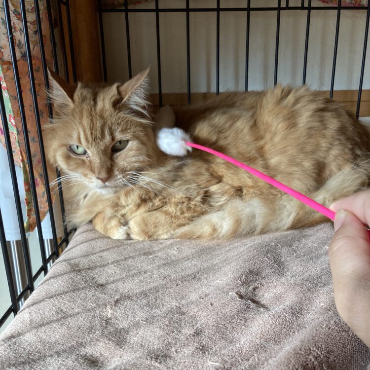 じゃらしでコミュニケーションを取ろうとする私と、迷惑そうなアンバー。