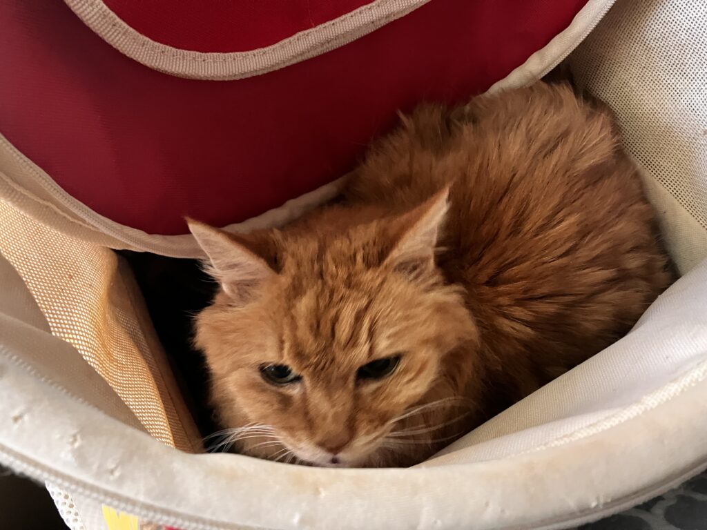 あたちはお出かけする気満々よ、とばかりにキャリーに収まっているアンバー。